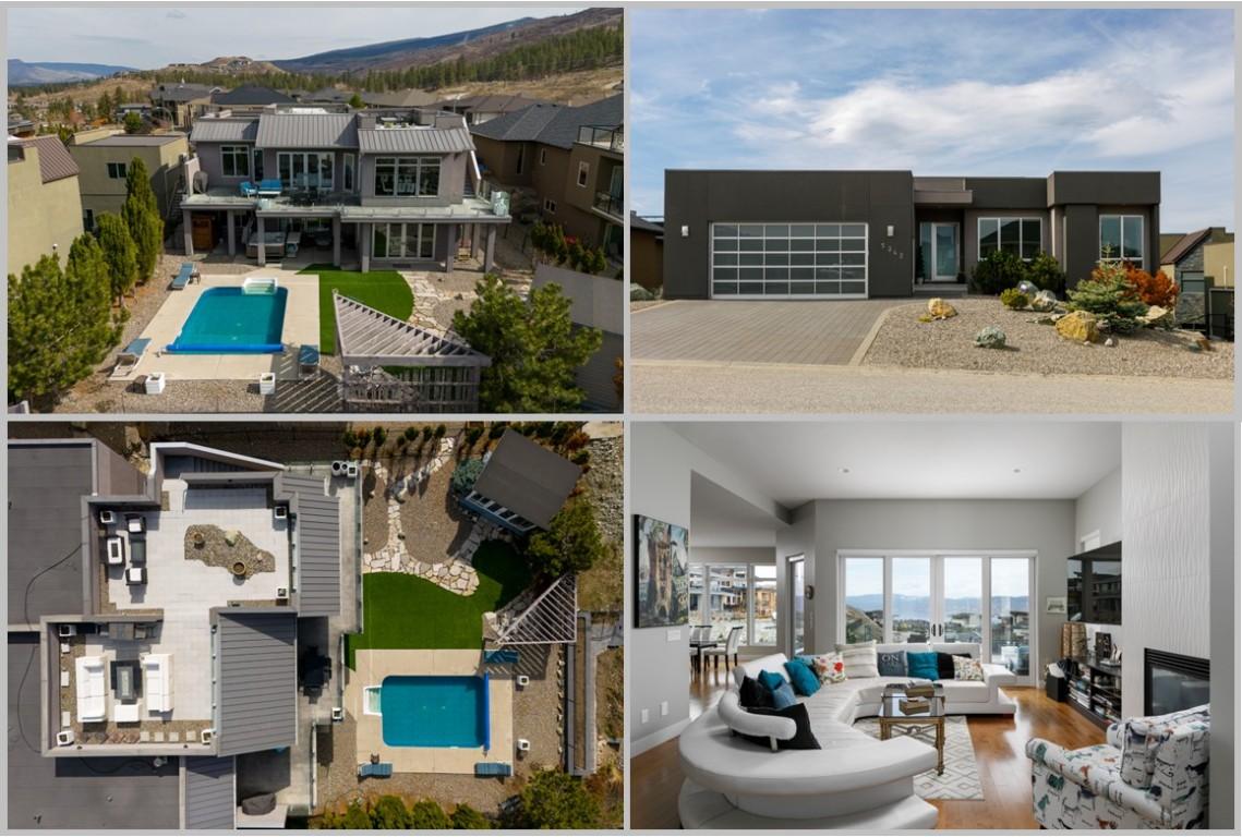 Stunning lake & mountain views, walls of windows, and crisp modern architecture come together in this exceptional Upper Mission walkout with rooftop patio overlooking your pool, the lake and city beyond! Impeccable finishings, open-concept living, and a quiet, upscale location make this home ideal for both entertaining and relaxing. The gourmet island kitchen flows seamlessly to a wraparound sundeck with panoramic southerly views overlooking the pool and lake. The main floor features a front office and a luxurious principal suite with spa-inspired ensuite. Downstairs offers spacious bedrooms, a large games/family room, media room, wine room, and steam shower bath—all with direct access to the sun-drenched pool & hot tub area and has suite potential. A detached backyard garden cottage shed provides potential for a summer guesthouse experience or utilize as you see fit! Additional features include: epoxied heated garage with 14’ ceilings & built-in storage (boat-ready), 10’ & 11’ ceilings, granite & glass finishes throughout, xeriscaped landscaping, walk-through pantry, and a rare 1,000 sq ft rooftop patio with breathtaking lake & mountain views—perfect for Okanagan evenings. Located in the prestigious Kettle Valley neighborhood, close to parks, schools, and the new Ponds shopping district. Move-in ready to enjoy the best of the Okanagan lifestyle.